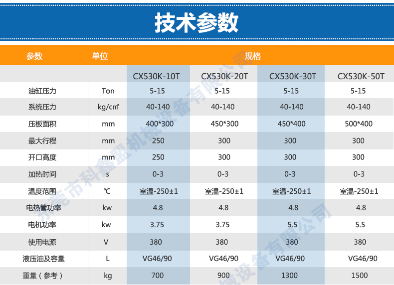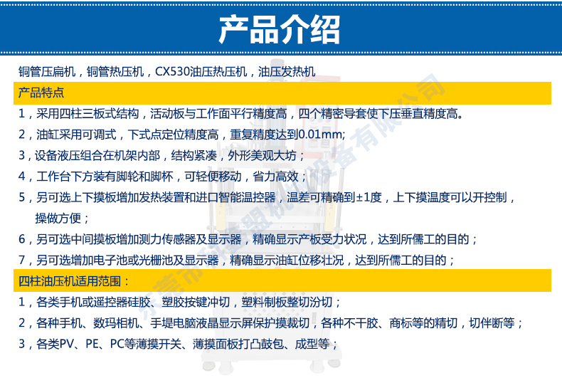 科鑫盟CX530K系列快速油压热压机,液压热压机采用四柱三板式结构,上下模板增加发热装置和进口智能温控器,液压系统内置油箱底部,外观整洁,稳重. 工作台下方装有脚轮和脚杯,可轻便移动。